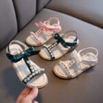 Introduce your little one to summer fashion with our girls’ pearl princess summer sandals. These charming sandals feature a stylish plaid pattern and beaded elements, perfect for adding a touch of elegance to any outfit. Available in white, green, and pink, they are designed with artificial leather and a non-slip Hua fang sole, ensuring both comfort and safety. The Velcro closure makes them easy to put on and take off, ideal for toddlers and young children.