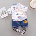 Introducing our stylish boys’ western short sleeve suit, perfect for keeping your little one comfortable and fashionable. This Korean-style pants suit includes a short-sleeve top and matching shorts, making it ideal for various occasions. Made from high-quality cotton, the suit is available in three vibrant colors featuring a cute lapel balloon dinosaur design.